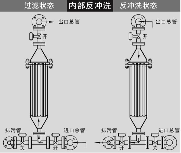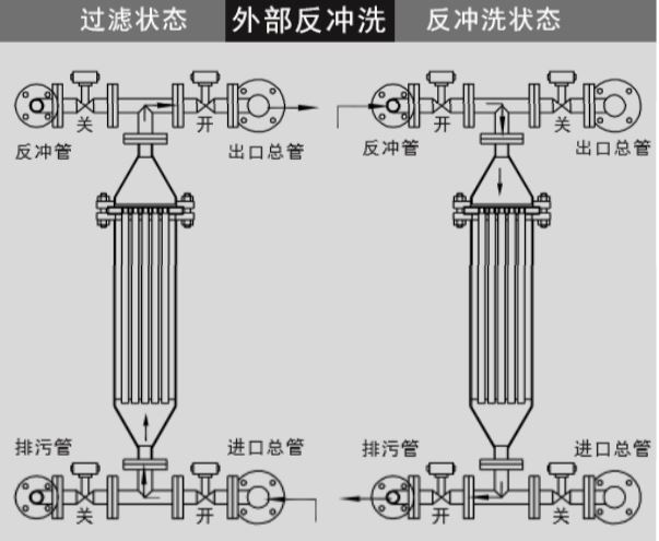 內(nèi)部反沖洗型: 利用其他過濾單元的濾液逆向流動來沖洗濾元外表面的濾餅;